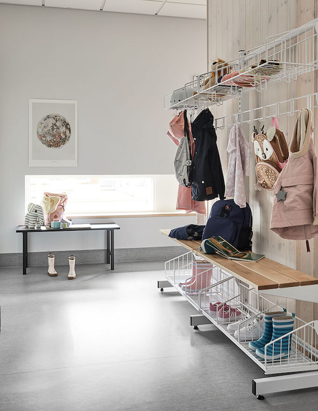 Model C: Skohylde med drypplade og tøjrum i perforeret stål, bænk og knagerække i birk.