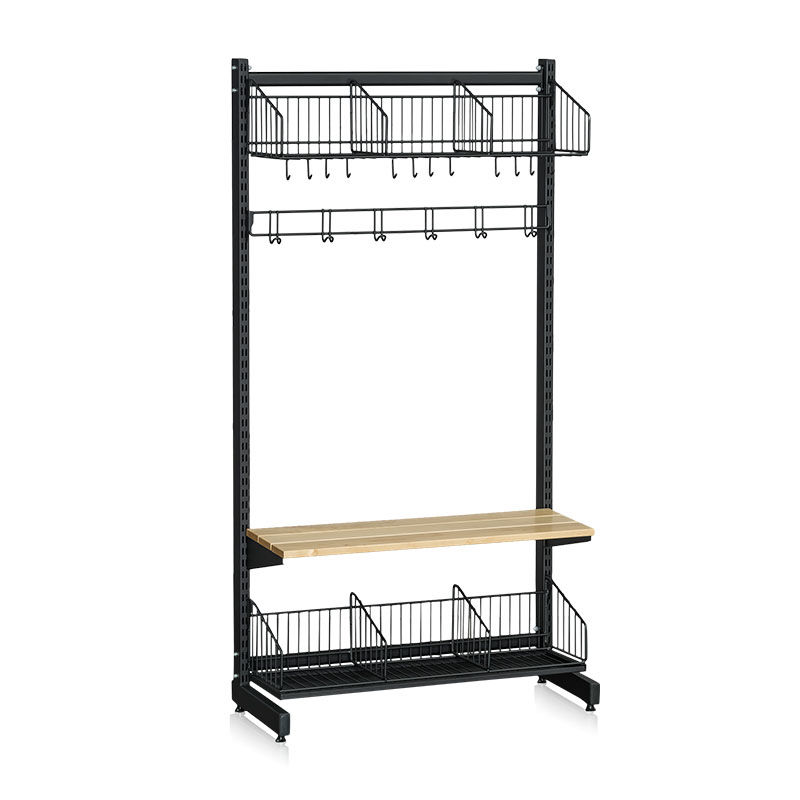 Model D: Vinklet skohylde og garderobehylde i perforeret stål, bænk i birk.