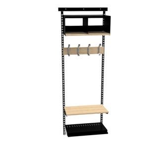 Model C: Skohylde med drypplade og tøjrum i perforeret stål, bænk og knagerække i birk.