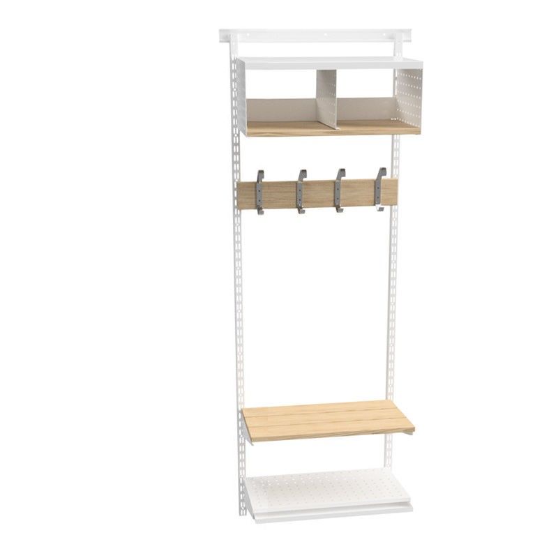 Garderobestativ Savalen væghængt, bredde 600 mm, hvid, model C, grundsektion. Praktisk og fleksibel garderobestativ med forskellige muligheder. Findes både som gulvstativ og vægstativ. Byg din egen løsning med grund- och tilbygningssektioner. Kan indstilles for hver 25 mm. Gulvstativet har indstillelige fødder. Model A: Skohylde med drypbakke, bænk, knagerække og hattehylde i tråddesign.