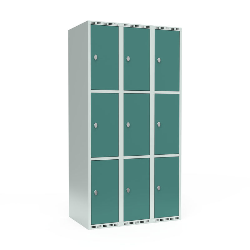 Elevskab Fydor SMG, BxDxH 900x550x1752 mm, 9 låger i 3 skab, plant tag, grøn/lysegrå. Med Fydor-serien får du en klassisk, men moderne fuldsvejset garderobe/elevskab med høj kvalitet og sikkerhed. Brugervenlige skabe med små rum, der passer ind i de fleste miljøer.
