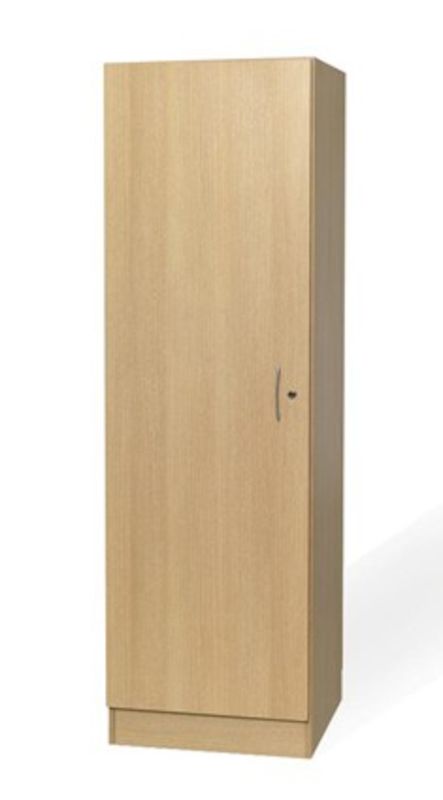 Garderobeskab Urd, HxBxD 2000 x 600 x 600 mm, eg. Enkel og praktisk klædeskab, der også kan anvendes som hyldeskab. De hvide hylder kan flyttes. Maks. belastning for hylder er 60 kg/hylde (udbredt belastning). Lågen er udstyret med cylinderlås med to nøgler. Lågen kan monteres som højre- eller venstrehængt. Sokkelhøjde 120 mm og bagsiden har udskæring til gulvliste. Leveres usamlet i flad, velemballeret emballage til sikker transport.