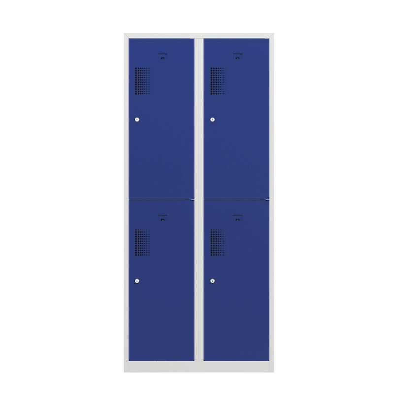 Omklædningsskab 2 delt Amsterdam, 2 sektioner, bredde 800 mm, 4 låger, lysegrå / ensianblå. Maksimal funktionalitet med minimalt pladsbehov – dette garderobeskab i to etager med lysegråt korpus udnytter pladsen til fulde: Det halvhøje skabsdesign med skabe i etager maksimerer antallet af personlige skabe med lås, samtidig med at pladsen udnyttes. Vælg bredde, antal sektioner og skabe i henhold til dine individuelle pladsbehov. Dette opbevaringsskab udgør en robust løsning til effektiv opbevaring af tøj til en række forskellige anvendelsesområder.