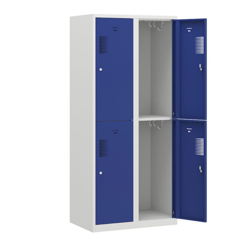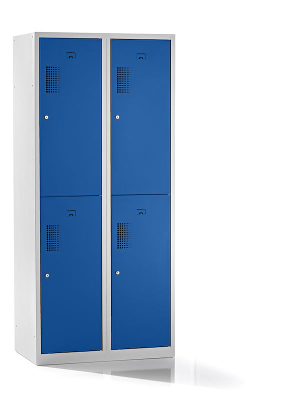 Skabet udmærker sig ved sin robuste konstruktion af pulverlakeret stål, hvilket gør skabet utroligt robust over for ridser og korrosion. Skabenes placering i to etager udnytter pladsen effektivt og er ideelt til omklædningsrum på værksteder, i idrætsforeninger eller på lagre. Den integrerede perforering giver en optimal luftcirkulation.