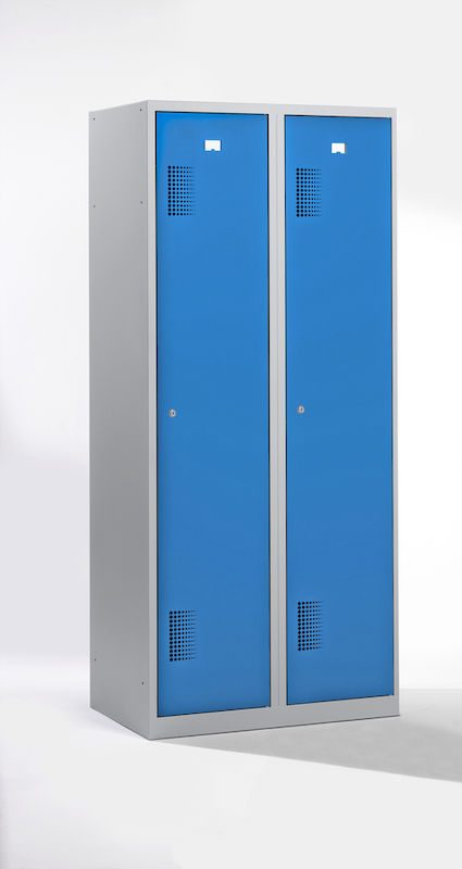 Omklædningsskab Amsterdam, 2 sektioner, lysegrå / lyseblå, bredde 800 mm, cylinderlås. Vores robuste garderobeskab med lysegråt korpus er ideelt til at holde orden og skabe sikkerhed.