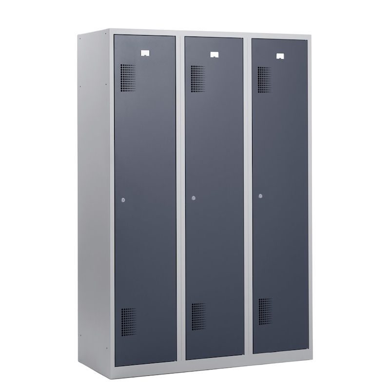 Omklædningsskab Amsterdam, 3 sektioner, lysegrå / basaltgrå, bredde 1200 mm, cylinderlås. Vores robuste garderobeskab med lysegråt korpus er ideelt til at holde orden og skabe sikkerhed.