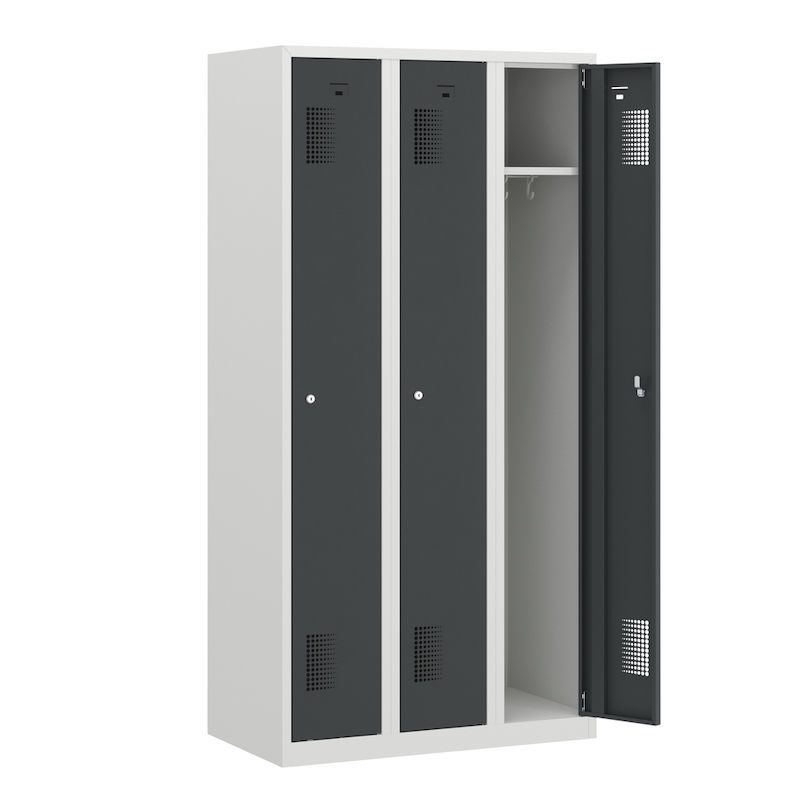 Omklædningsskab Amsterdam, 3 sektioner, lysegrå / basaltgrå, bredde 900 mm, cylinderlås