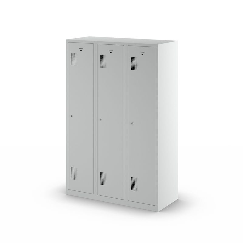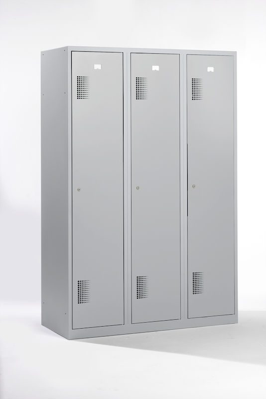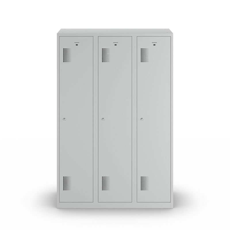 Omklædningsskab Amsterdam, 3 sektioner, lysegrå, bredde 1200 mm, cylinderlås. Vores robuste garderobeskab med lysegråt korpus er ideelt til at holde orden og skabe sikkerhed.