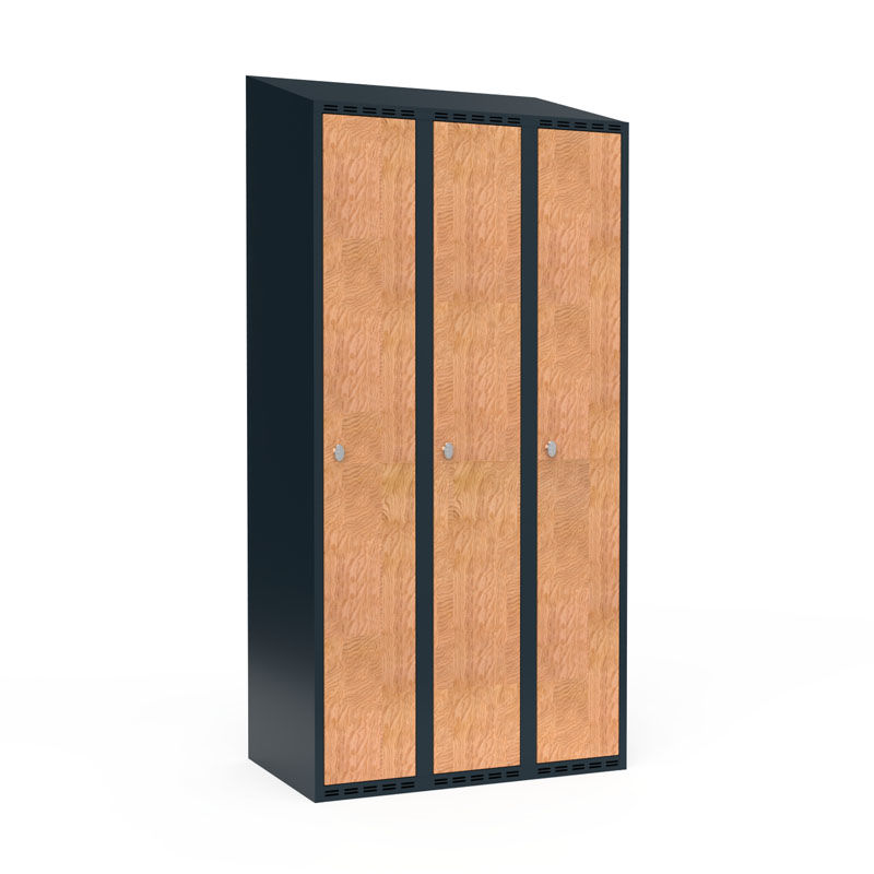 Omklædningsskab Fydor FFF, BxDxH 900x550x1900 mm, 3 låger i 3 skab, skråt tag, antracit/eg. Med Fydor-serien får du en klassisk, men moderne fuldsvejset garderobe med høj kvalitet og sikkerhed. Brugervenlige omklædningsskabe, der passer ind i de fleste miljøer.