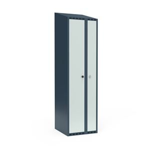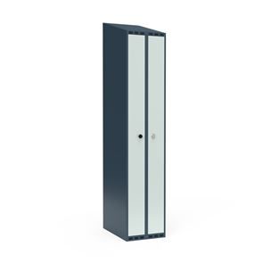 Omklædningsskab Fydor SMC med dobbeltlåger, 1 plads 300+200 mm, skråt tag, lysegrå/grå. Med Fydor-serien får du en klassisk, men moderne fuldsvejset garderobe med høj kvalitet og sikkerhed. Brugervenlige omklædningsskabe, der passer ind i de fleste miljøer.