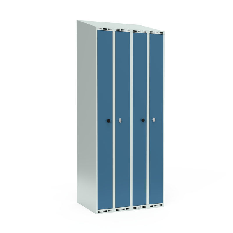 Omklædningsskab Fydor SMC med dobbeltlåger, 2 pladser 200+200 mm, skråt tag, blå/lysegrå. Med Fydor-serien får du en klassisk, men moderne fuldsvejset garderobe med høj kvalitet og sikkerhed. Brugervenlige omklædningsskabe, der passer ind i de fleste miljøer.