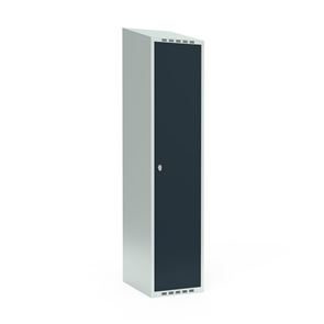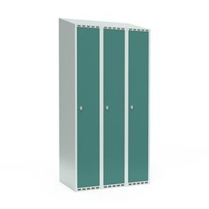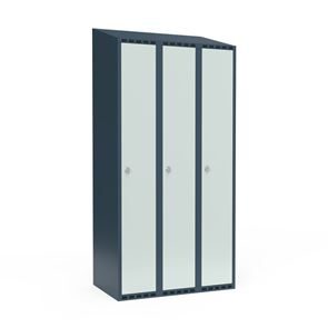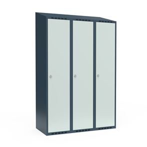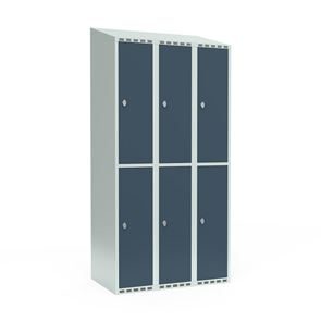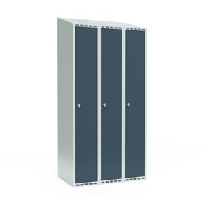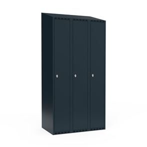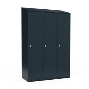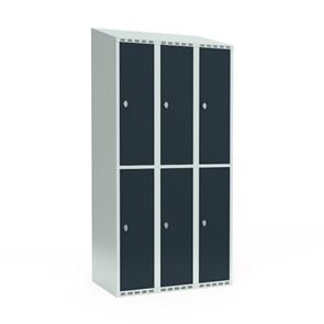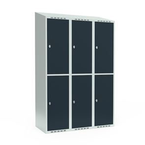 Omklædningsskab Fydor SMG, BxDxH 1200x550x1900 mm, 6 låger i 3 skabe, skråt tag, antracit/lysegrå. Med Fydor-serien får du en klassisk, men moderne fuldsvejset garderobe med høj kvalitet og sikkerhed. Brugervenlige omklædningsskabe, der passer ind i de fleste miljøer.