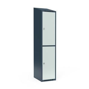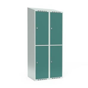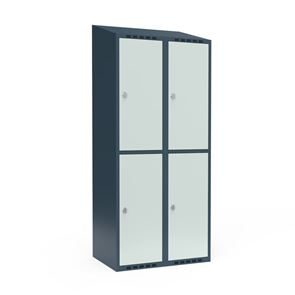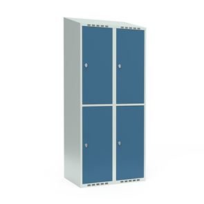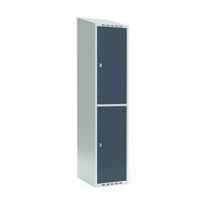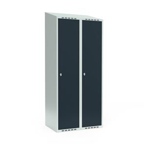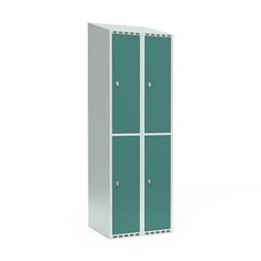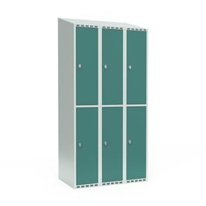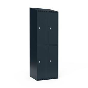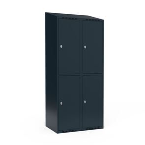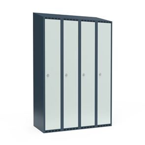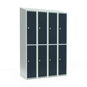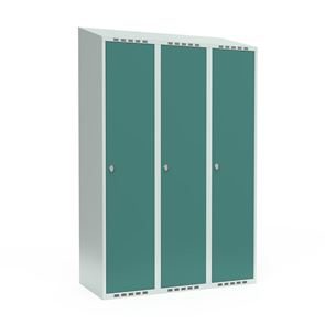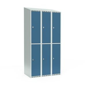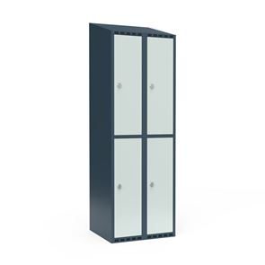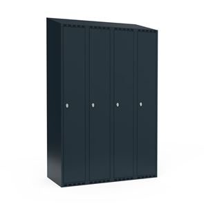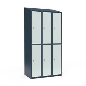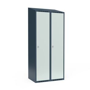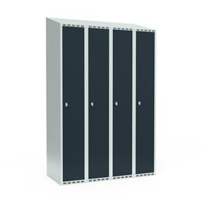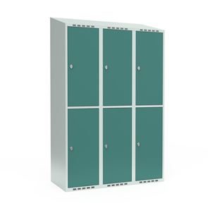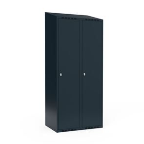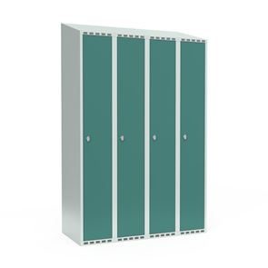 Skrå top gør garderoben nemmere at rengøre og skaber mulighed for at tilslutte til et eksisterende ventilation via tilbygning. Lockerskabene leveres med en påsvejset hattehylde og en kraftig bøjlestang med dobbelte ankerkroge. Skabe med to låger i højden leveres med kraftig bøjlestang og dobbelte ankerkroge i hvert rum. Skabene leveres klar til brug med monterede låse og fuldsvejsede bunde, der letter monteringen.