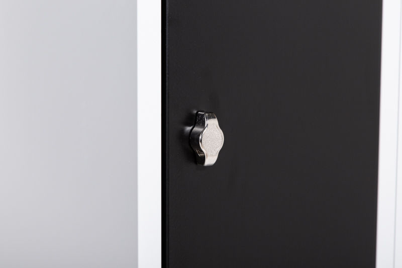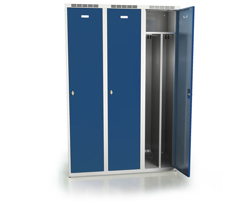 Omklædningsskab Hove, B 400 mm, 3x1 døre, gråt kabinet blå dør. Omklædningsskab Hove. Her får du virkelig meget skab for pengene! Lige til at sætte ind på plads. Hurtig levering. Vælg mellem 2 forskellige fagbredder 300 og 400 mm. Leveres som standard med 40 mm sokkel med mulighed for at tilkøbe en ekstra høj sokkel, benstel eller bænkestativ. Skab med hel dør leveres med hattehylde, klædestang og kroge. Opdeling i 400 mm skabet til f.eks. at adskille beskidt fra rent tøj. Kabinettet er pulverlakeret i grå RAL 7035 og dørene er enten i blå RAL 5005 eller sort RAL 9005. Skabet er udstyret med klinke til hængelås i diameter 5-8 mm.
