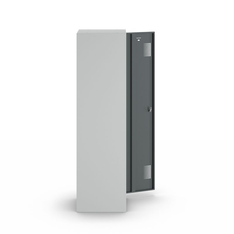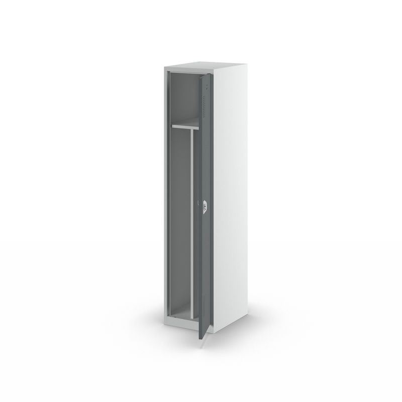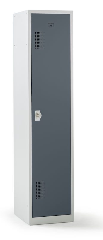 Omklædningsskab med skillevæg Amsterdam, 1 sektion, lysegrå / basaltgrå, bredde 400 mm. Vores stabile garderobeskab med lysegråt korpus udmærker sig ved sin funktionalitet, robusthed og kvalitet for pengene. Den svejsede stålpladekonstruktion giver skabet en lang levetid og opfylder de høje krav, der stilles til omklædningsskabe i arbejdsmiljøer. En perforering i lågen garanterer fx en optimal luftcirkulation i forbindelse med opbevaring af arbejdstøj.