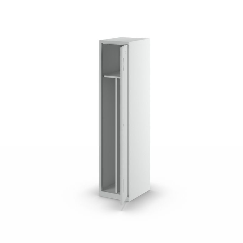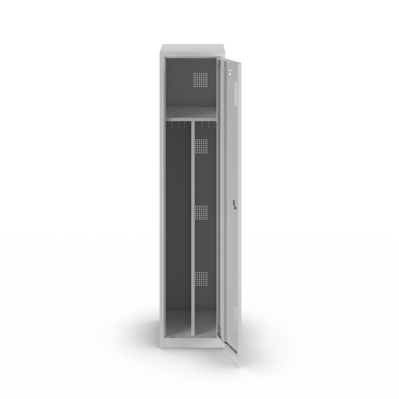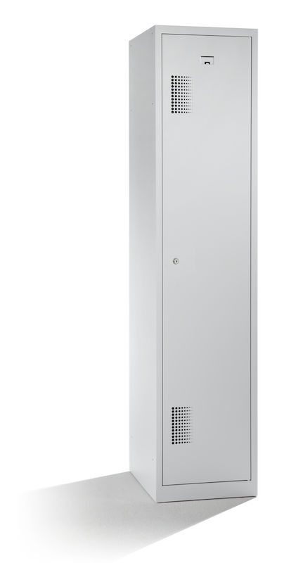 Omklædningsskab med skillevæg Amsterdam, 1 sektion, lysegrå, bredde 400 mm, cylinderlås. Vores stabile garderobeskab med lysegråt korpus udmærker sig ved sin funktionalitet, robusthed og kvalitet for pengene. Den svejsede stålpladekonstruktion giver skabet en lang levetid og opfylder de høje krav, der stilles til omklædningsskabe i arbejdsmiljøer. En perforering i lågen garanterer fx en optimal luftcirkulation i forbindelse med opbevaring af arbejdstøj.
