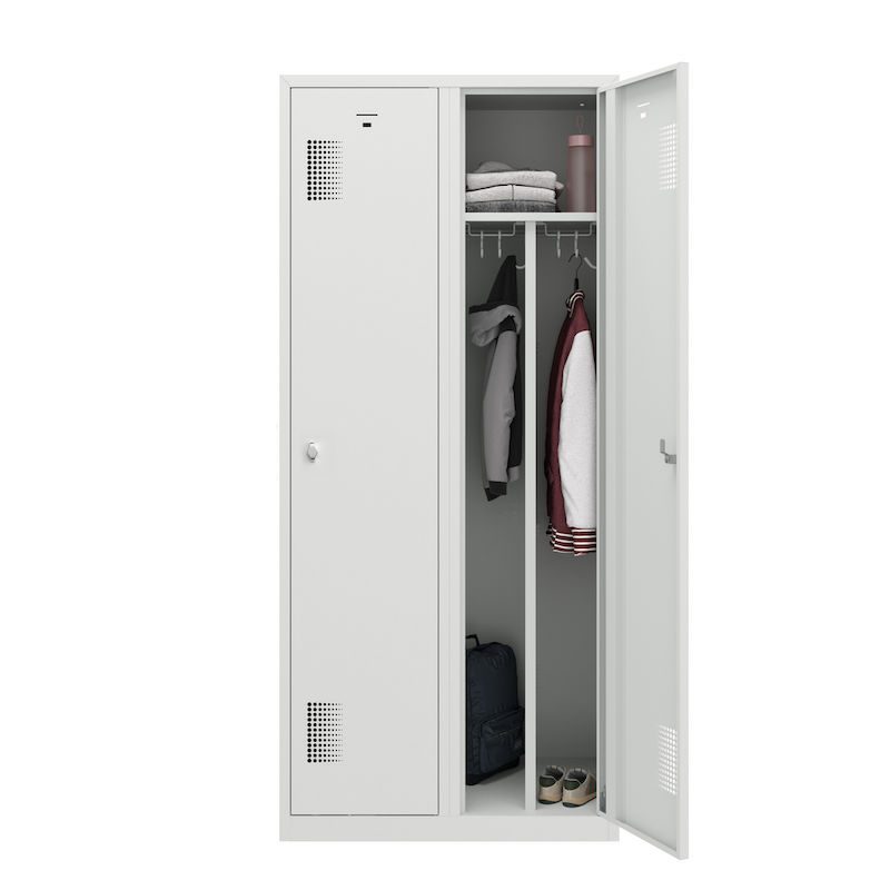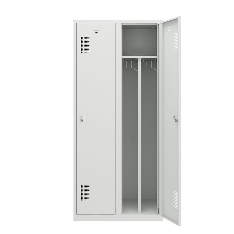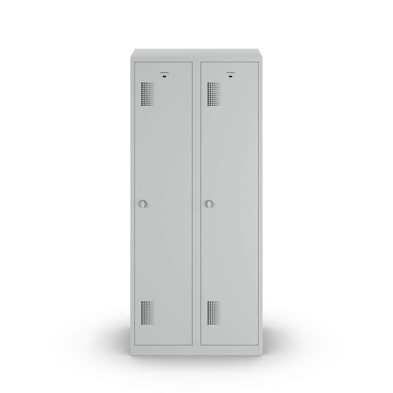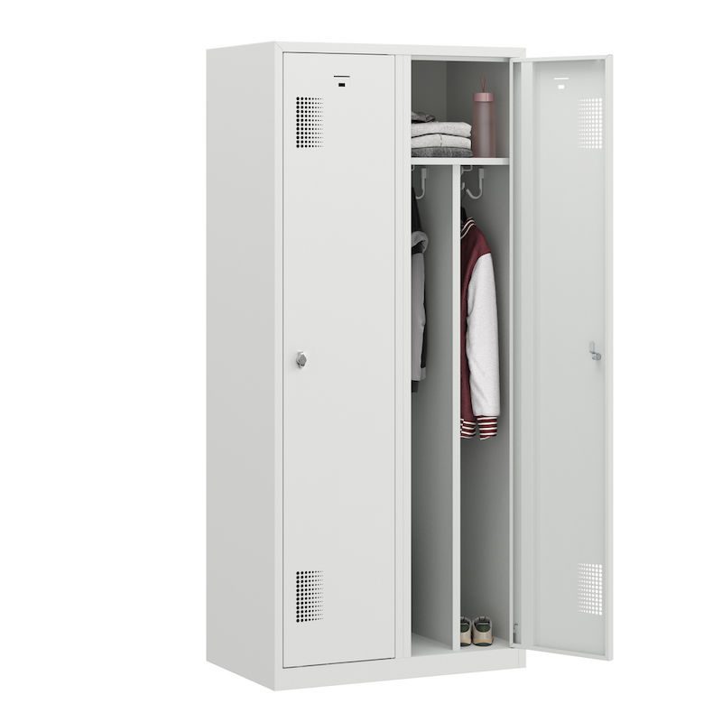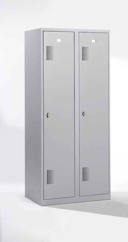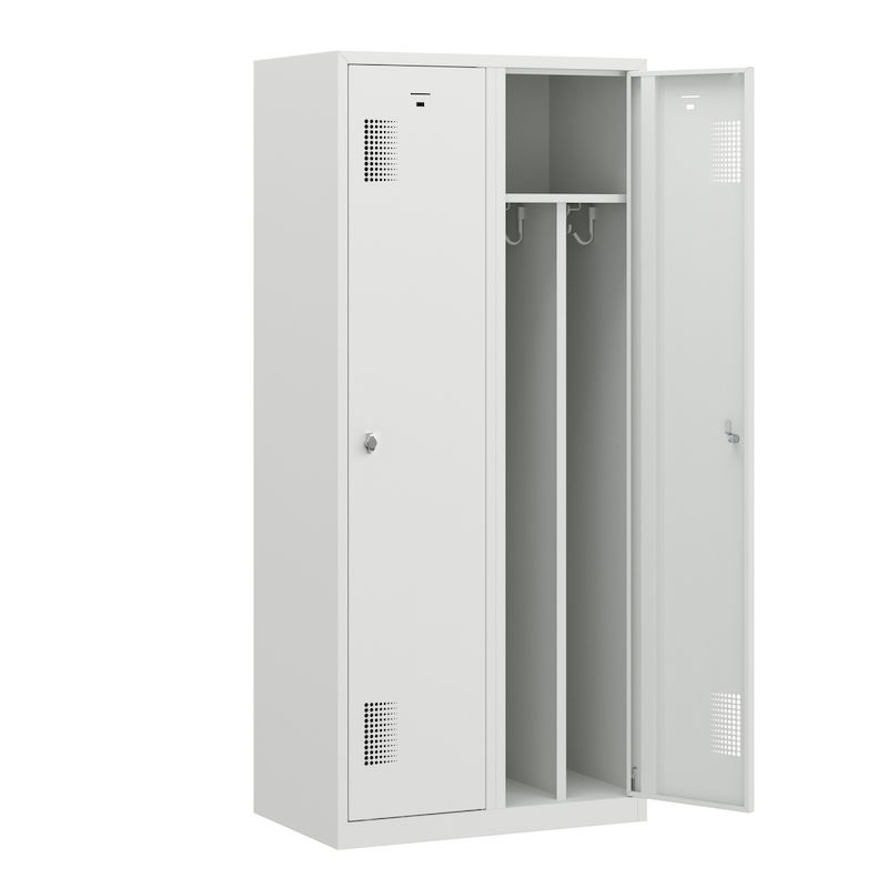 Omklædningsskab med skillevæg Amsterdam, 2 sektioner, lysegrå, bredde 800 mm. Vores stabile garderobeskab med lysegråt korpus udmærker sig ved sin funktionalitet, robusthed og kvalitet for pengene. Den svejsede stålpladekonstruktion giver skabet en lang levetid og opfylder de høje krav, der stilles til omklædningsskabe i arbejdsmiljøer. En perforering i lågen garanterer fx en optimal luftcirkulation i forbindelse med opbevaring af arbejdstøj.