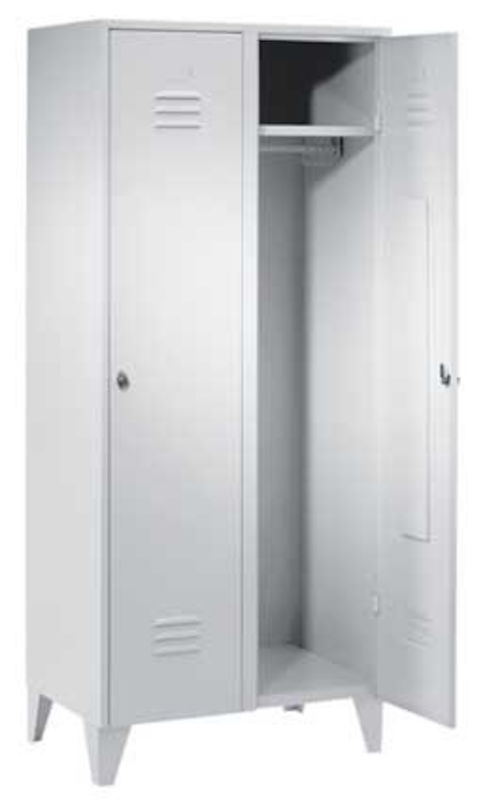 Aflåseligt stålskab i stabil konstruktion og klassisk design. Fremstillet i svejset stål, med forstærkede døre. Leveres med klinke til hængelås, hattehylde, klædestang inkl. 3 flytbare kroge samt ben Cylinderlås kan tilkøbes mod ekstra betaling. Findes i Lysegrå RAL 7035 eller Blågrå RAL 7031.