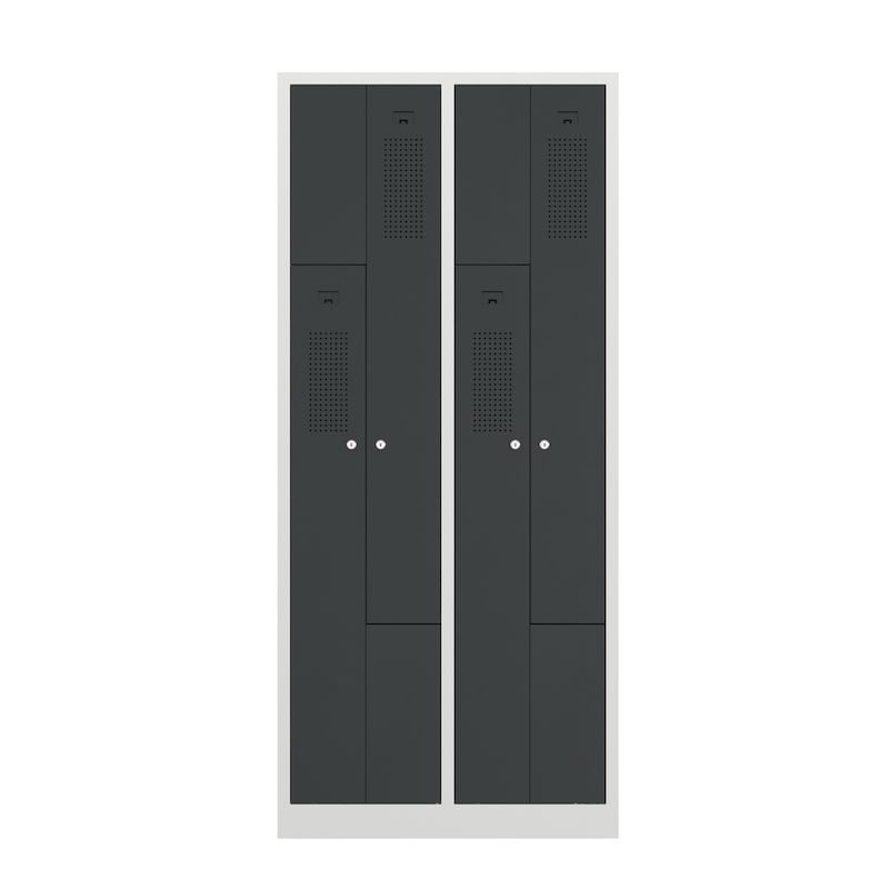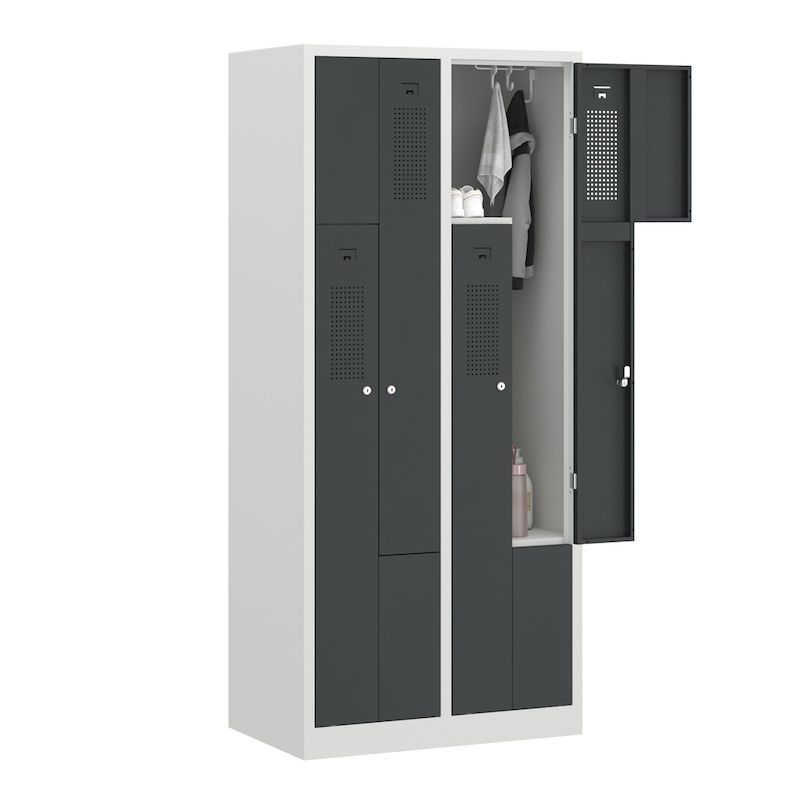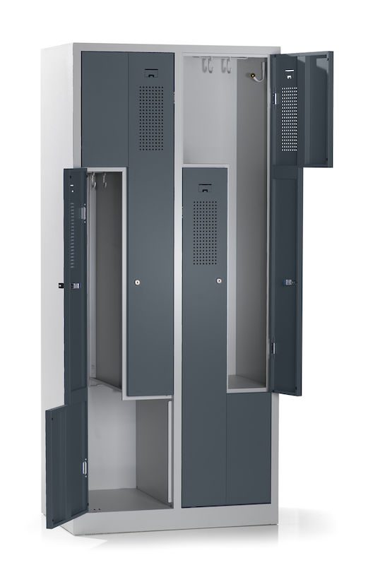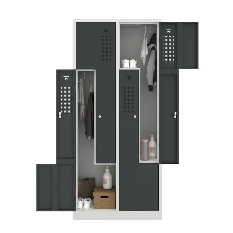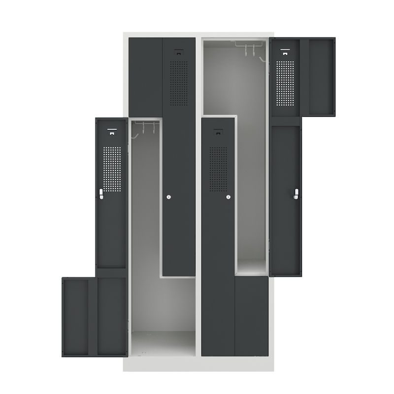 Et Z-omklædningsskab kombinerer et pladsbesparende design med gennemtænkt funktionalitet. Dette stålgarderobeskab egner sig perfekt til omklædningsrum i virksomheder og fritidsfaciliteter og rummer to garderobeskabe på samme plads som ét. Det intelligente Z-formede skabslayout er en effektiv tøjopbevaringsløsning, hvor der tages højde for brugervenligheden.