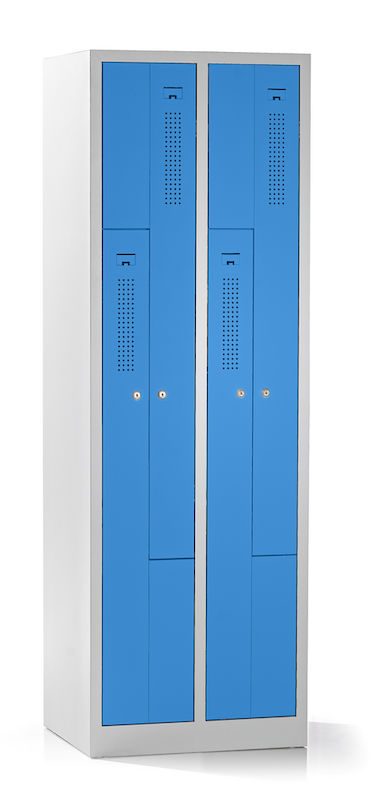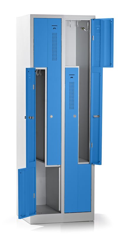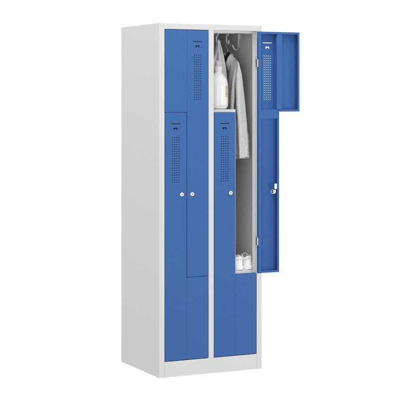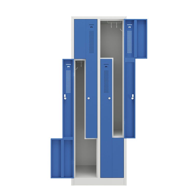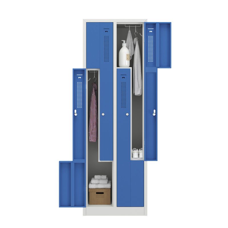 Et Z-omklædningsskab kombinerer et pladsbesparende design med gennemtænkt funktionalitet. Dette stålgarderobeskab egner sig perfekt til omklædningsrum i virksomheder og fritidsfaciliteter og rummer to garderobeskabe på samme plads som ét. Det intelligente Z-formede skabslayout er en effektiv tøjopbevaringsløsning, hvor der tages højde for brugervenligheden.