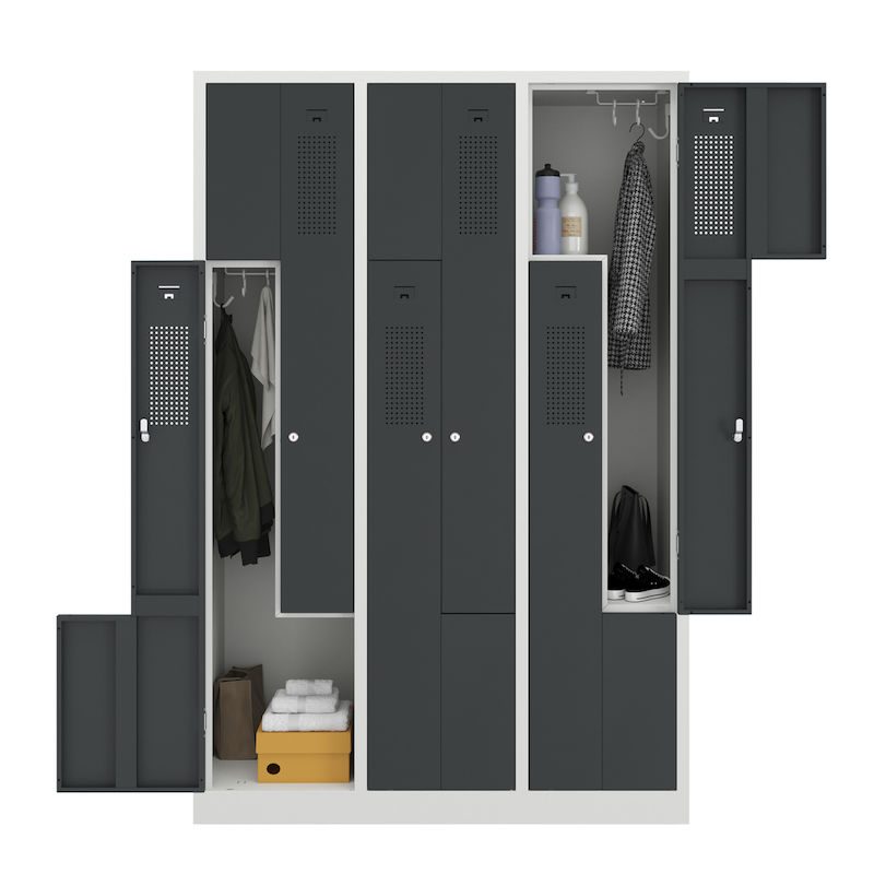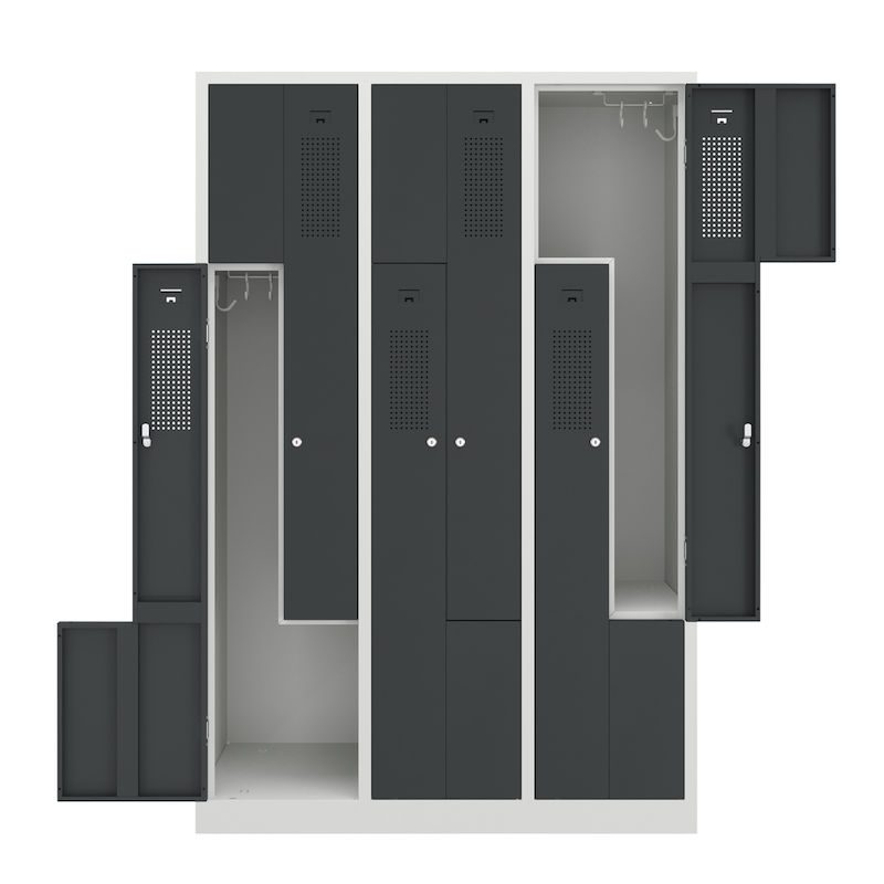 Et Z-omklædningsskab kombinerer et pladsbesparende design med gennemtænkt funktionalitet. Dette stålgarderobeskab egner sig perfekt til omklædningsrum i virksomheder og fritidsfaciliteter og rummer to garderobeskabe på samme plads som ét. Det intelligente Z-formede skabslayout er en effektiv tøjopbevaringsløsning, hvor der tages højde for brugervenligheden.