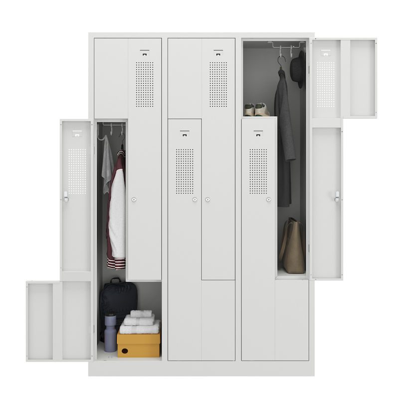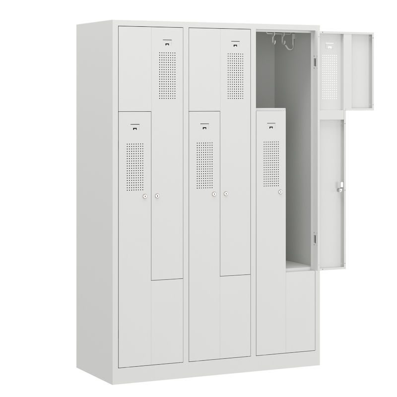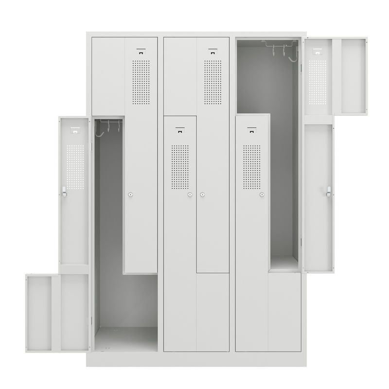 Et Z-omklædningsskab kombinerer et pladsbesparende design med gennemtænkt funktionalitet. Dette stålgarderobeskab egner sig perfekt til omklædningsrum i virksomheder og fritidsfaciliteter og rummer to garderobeskabe på samme plads som ét. Det intelligente Z-formede skabslayout er en effektiv tøjopbevaringsløsning, hvor der tages højde for brugervenligheden.