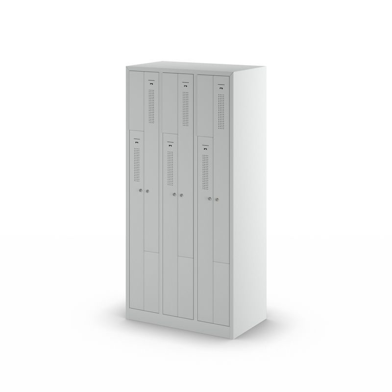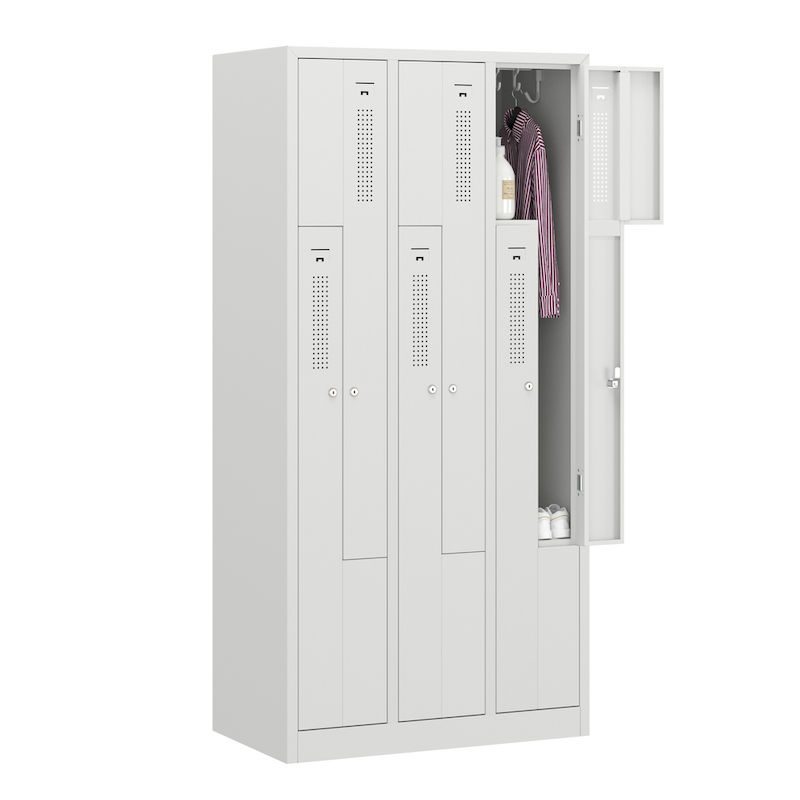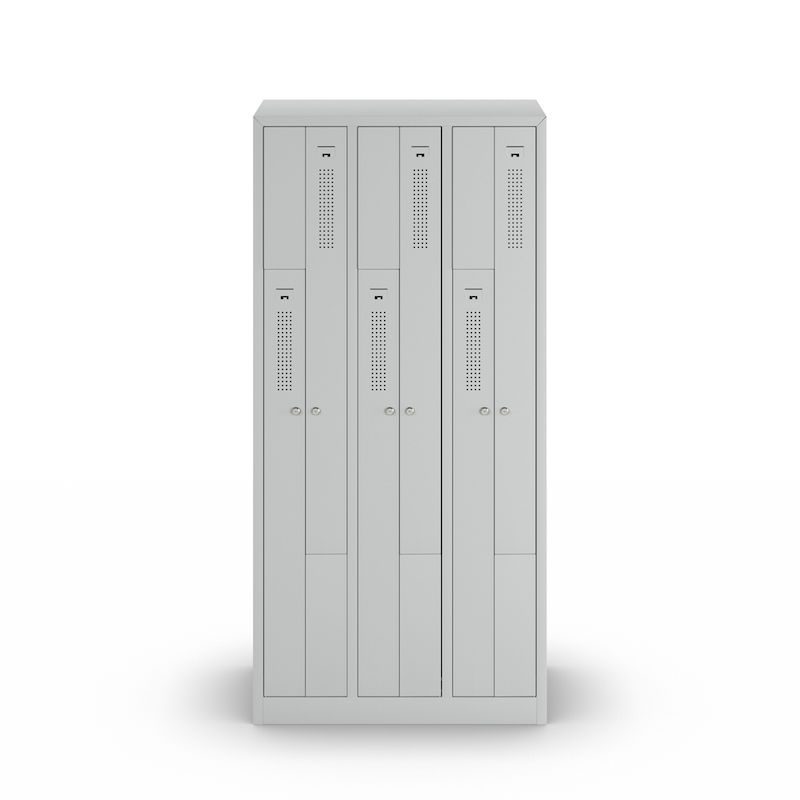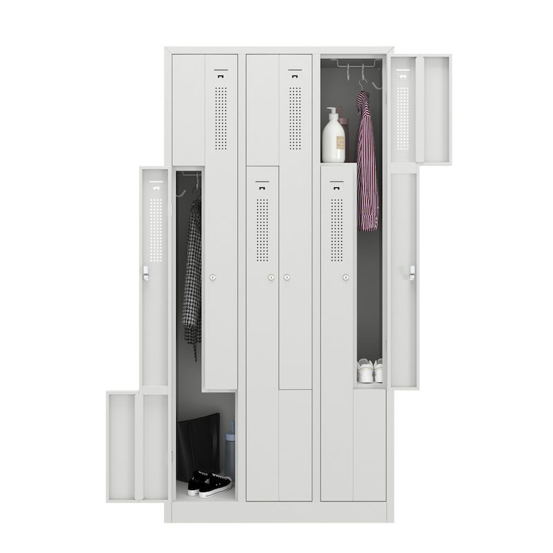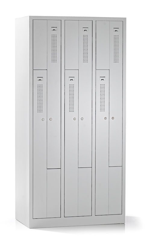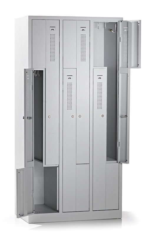 Et Z-omklædningsskab kombinerer et pladsbesparende design med gennemtænkt funktionalitet. Dette stålgarderobeskab egner sig perfekt til omklædningsrum i virksomheder og fritidsfaciliteter og rummer to garderobeskabe på samme plads som ét. Det intelligente Z-formede skabslayout er en effektiv tøjopbevaringsløsning, hvor der tages højde for brugervenligheden.