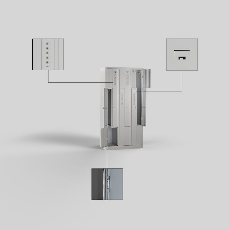 Med sin robuste, svejsede stålpladekonstruktion og lækre pulverlakerede finish har Z-omklædningsskabet en lang levetid og er driftsikkert – også på steder med mange brugere. Omklædningsskabet er gulvstående med en frihøjde på 80 mm.