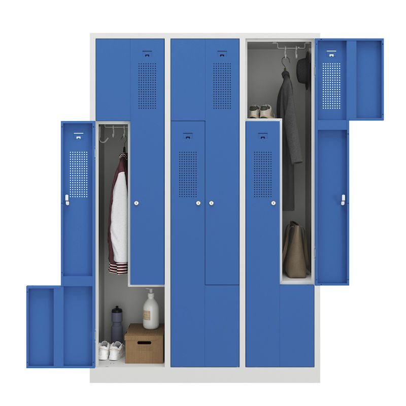 Et Z-omklædningsskab kombinerer et pladsbesparende design med gennemtænkt funktionalitet. Dette stålgarderobeskab egner sig perfekt til omklædningsrum i virksomheder og fritidsfaciliteter og rummer to garderobeskabe på samme plads som ét. Det intelligente Z-formede skabslayout er en effektiv tøjopbevaringsløsning, hvor der tages højde for brugervenligheden.