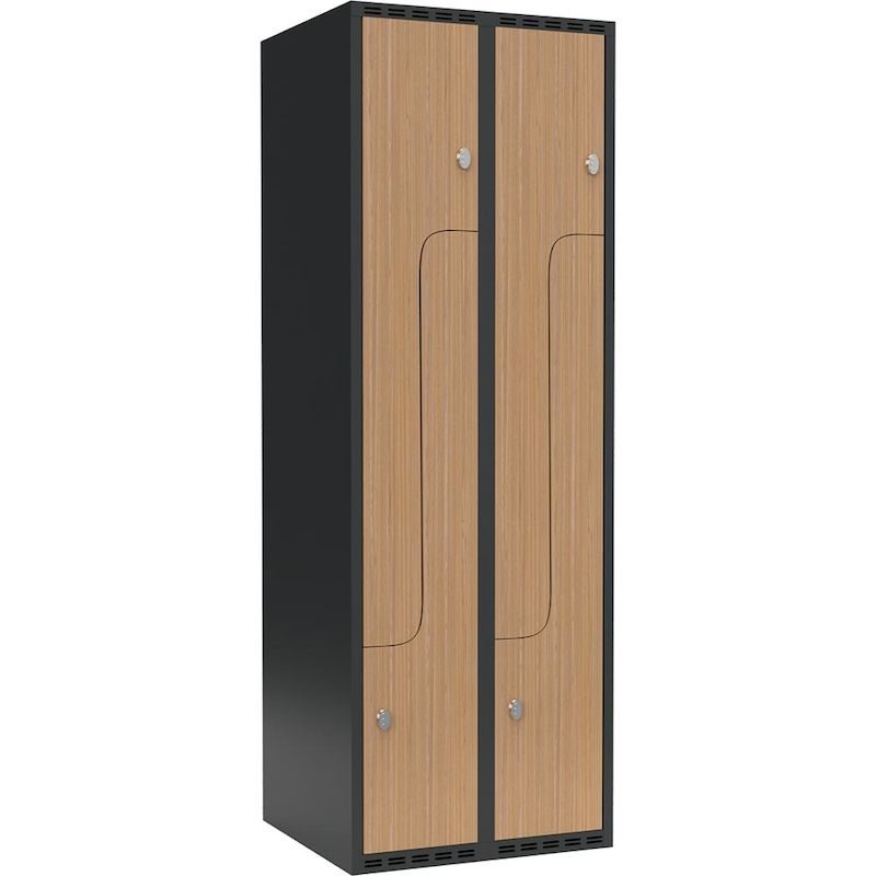 Z-skab Fydor SMZ, BxDxH 600x550x1752 mm, 4 låger i 2 skab, plant tag, antracit/eg. Med Fydor-serien får du en klassisk, men moderne fuldsvejset garderobe med høj kvalitet og sikkerhed. Brugervenlige omklædningsskabe, der passer ind i de fleste miljøer.