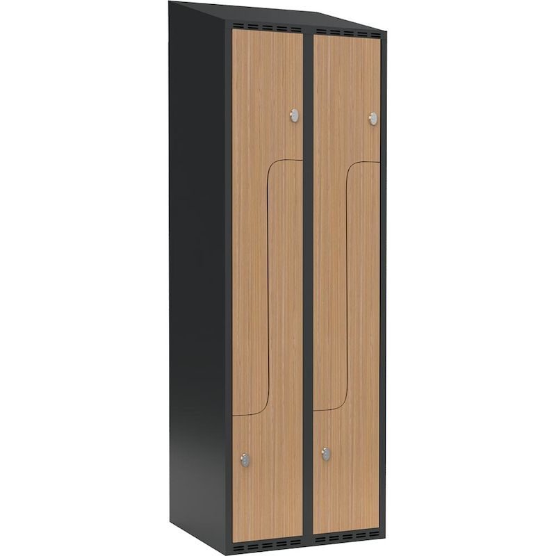 Z-skab Fydor SMZ, BxDxH 600x550x1900 mm, 4 låger i 2 skab, skråt tag, antracit/eg. Med Fydor-serien får du en klassisk, men moderne fuldsvejset garderobe med høj kvalitet og sikkerhed. Brugervenlige omklædningsskabe, der passer ind i de fleste miljøer.