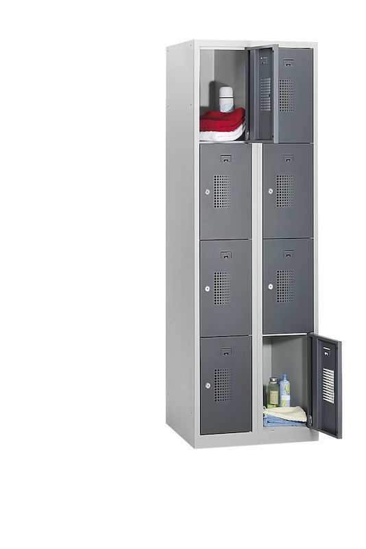 Smårumsskab med 4 skabe Amsterdam. Vores prisvenlige smårumsskab imponerer med sin funktionalitet, lange holdbarhed og alsidige anvendelsesmuligheder. Skabets korpus er lysegrå og er nemt at rengøre. Pulverlakeret 0,70 mm tykt stål garanterer den nødvendige sikkerhed ved opbevaring af personlige værdigenstande. Varier antallet af skabe, låsetype, lågefarve og skabsbredde efter behov og individuelle pladsforhold. Optimal luftcirkulation takket være perforering i metalskabets låger.