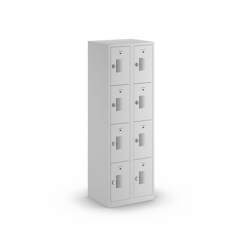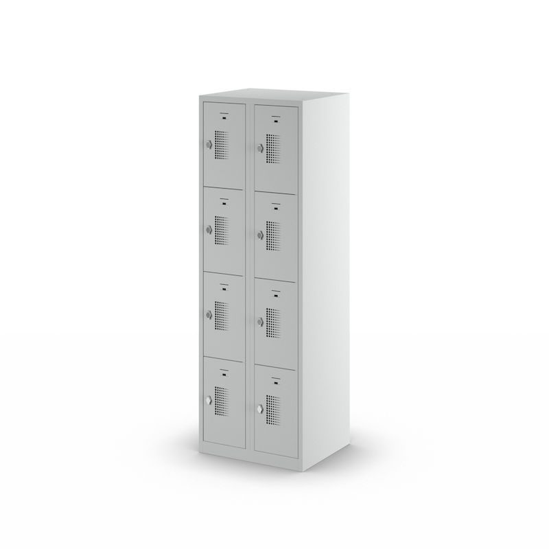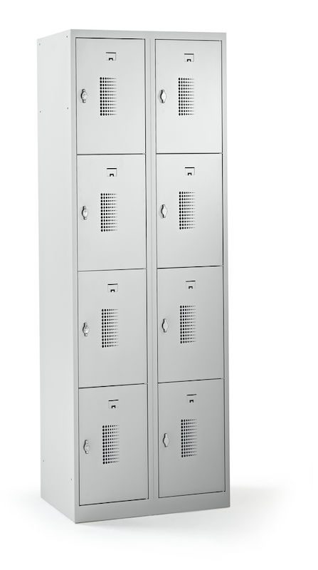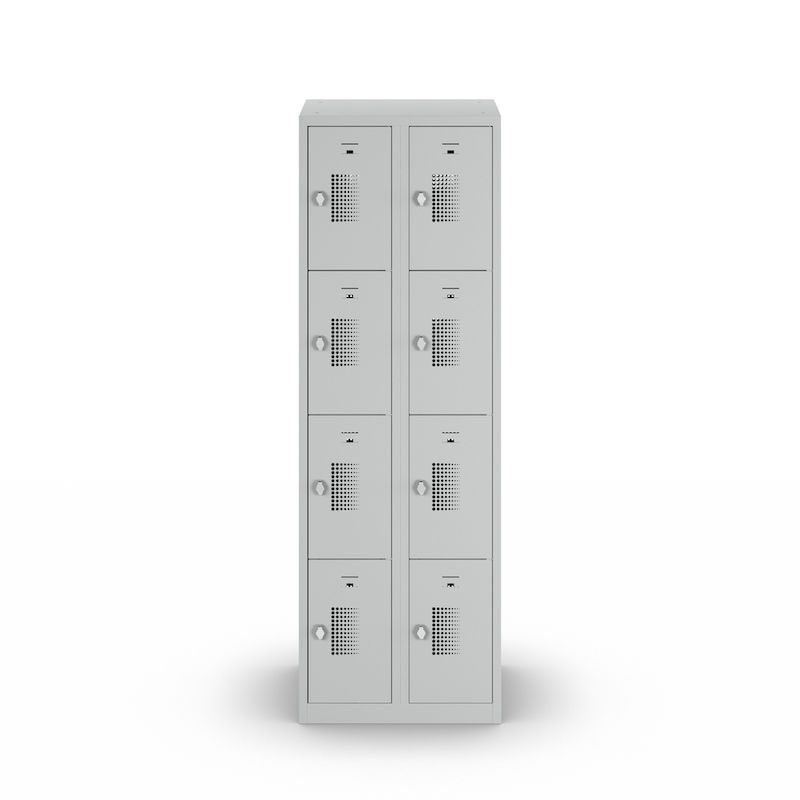 Smårumsskab med 4 skabe Amsterdam, 2 sektioner, lysegrå, B 600 mm, 8 låger, vrider. Vores prisvenlige smårumsskab imponerer med sin funktionalitet, lange holdbarhed og alsidige anvendelsesmuligheder. Skabets korpus er lysegrå og er nemt at rengøre. Pulverlakeret 0,70 mm tykt stål garanterer den nødvendige sikkerhed ved opbevaring af personlige værdigenstande. Varier antallet af skabe, låsetype, lågefarve og skabsbredde efter behov og individuelle pladsforhold. Optimal luftcirkulation takket være perforering i metalskabets låger.