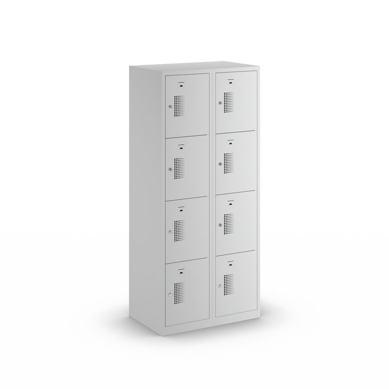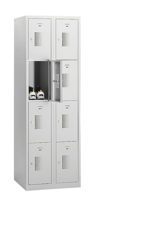 Smårumsskab med 4 skabe Amsterdam, 2 sektioner, lysegrå, B 800 mm, 8 låger, cylinderlås. Vores prisvenlige smårumsskab imponerer med sin funktionalitet, lange holdbarhed og alsidige anvendelsesmuligheder. Skabets korpus er lysegrå og er nemt at rengøre. Pulverlakeret 0,70 mm tykt stål garanterer den nødvendige sikkerhed ved opbevaring af personlige værdigenstande. Varier antallet af skabe, låsetype, lågefarve og skabsbredde efter behov og individuelle pladsforhold. Optimal luftcirkulation takket være perforering i metalskabets låger.