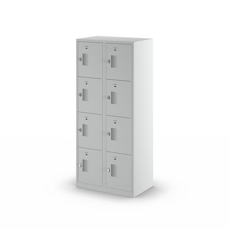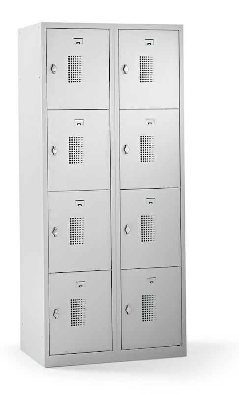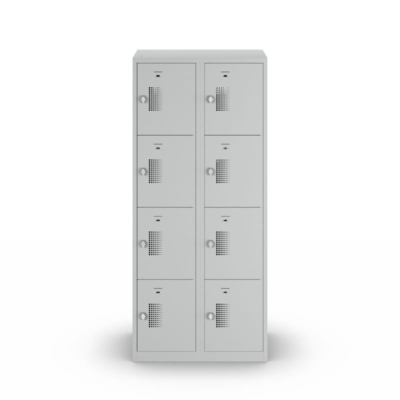 Smårumsskab med 4 skabe Amsterdam, 2 sektioner, lysegrå, B 800 mm, 8 låger, vrider. Vores prisvenlige smårumsskab imponerer med sin funktionalitet, lange holdbarhed og alsidige anvendelsesmuligheder. Skabets korpus er lysegrå og er nemt at rengøre. Pulverlakeret 0,70 mm tykt stål garanterer den nødvendige sikkerhed ved opbevaring af personlige værdigenstande. Varier antallet af skabe, låsetype, lågefarve og skabsbredde efter behov og individuelle pladsforhold. Optimal luftcirkulation takket være perforering i metalskabets låger.