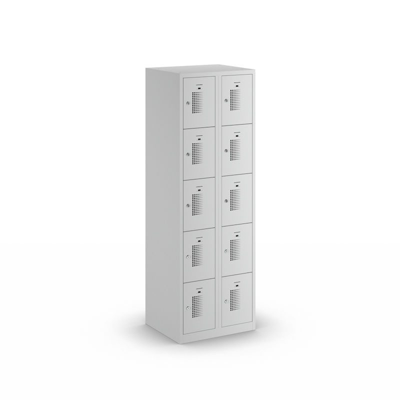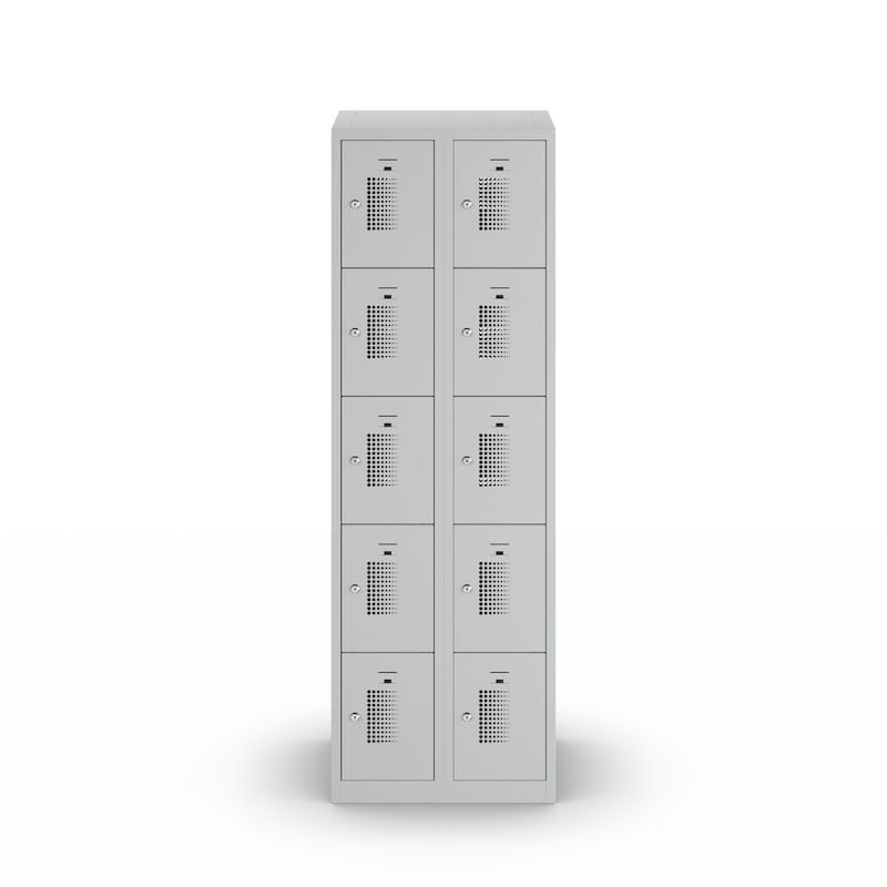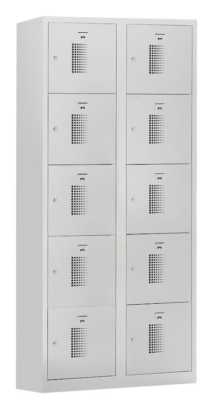 Smårumsskab med 5 skabe Amsterdam, 2 sektioner, lysegrå, B 600 mm, 10 låger, cylinderlås. Vores prisvenlige smårumsskab imponerer med sin funktionalitet, lange holdbarhed og alsidige anvendelsesmuligheder. Skabets korpus er lysegrå og er nemt at rengøre. Pulverlakeret 0,70 mm tykt stål garanterer den nødvendige sikkerhed ved opbevaring af personlige værdigenstande. Varier antallet af skabe, låsetype, lågefarve og skabsbredde efter behov og individuelle pladsforhold. Optimal luftcirkulation takket være perforering i metalskabets låger. For nem individualisering er hver låge endvidere udstyret med en mærkatholder på 30 x 50 mm.