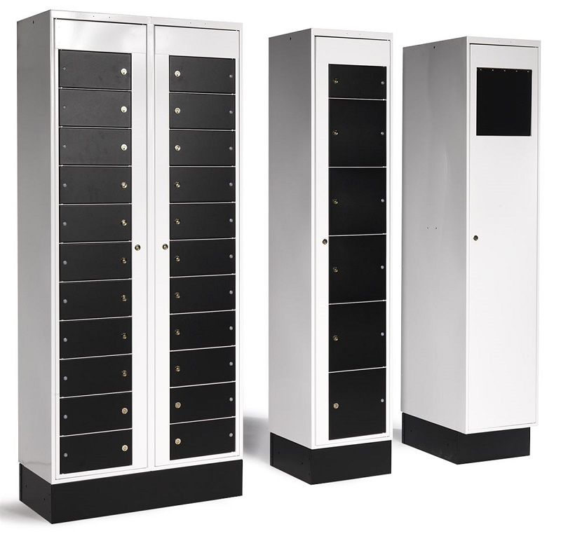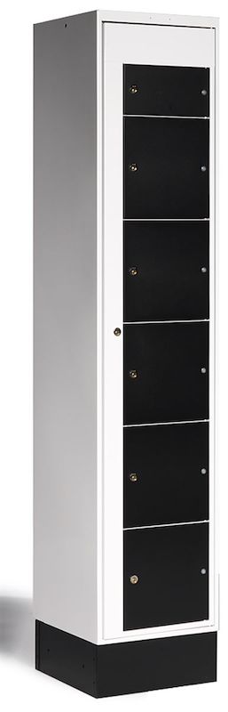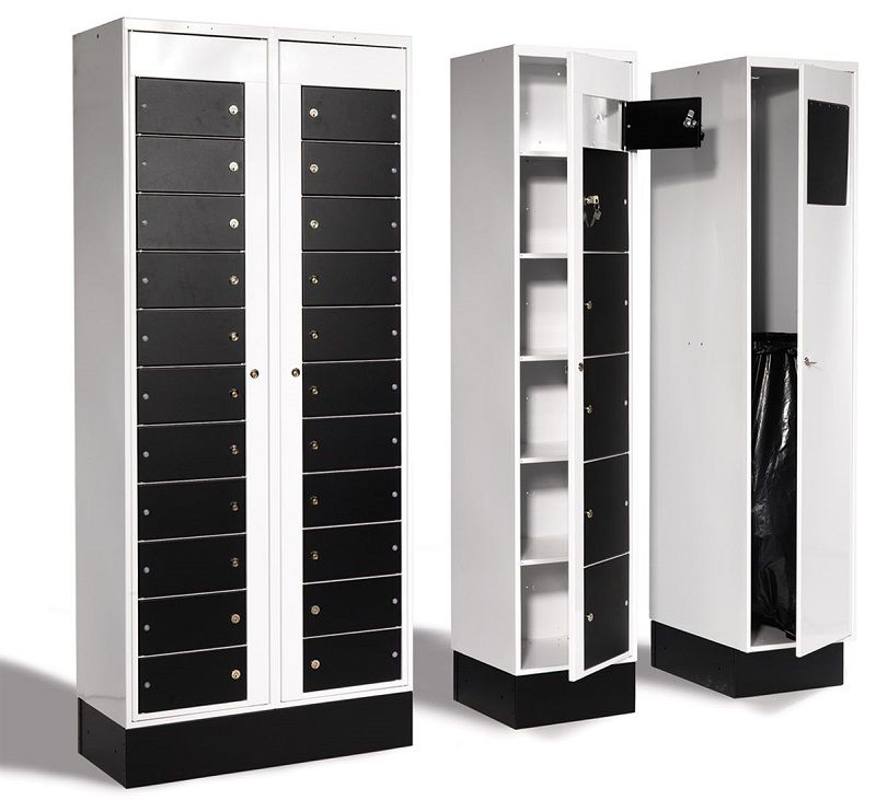 Linnedskab i stål med lås, 5 + 1 rum, B 400 mm, D 550 mm. Til enkle tøjskift. Hver låge til tøjrummene har separat ASSA-lås, hele fronten kan åbnes med hovednøgle. Findes i to udførelser, 11 rum eller 5+1 rum pr. dør. Højde 1900 mm.