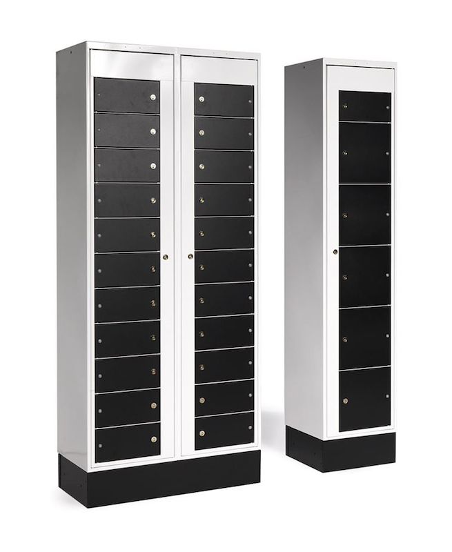 Linnedskabe i stål med lås, 11 rum, B 400 mm. Til enkle tøjskift. Hver låge til tøjrummene har separat ASSA-lås, hele fronten kan åbnes med hovednøgle. Findes i to udførelser, 11 rum eller 5+1 rum pr. dør. Højde 1900 mm.