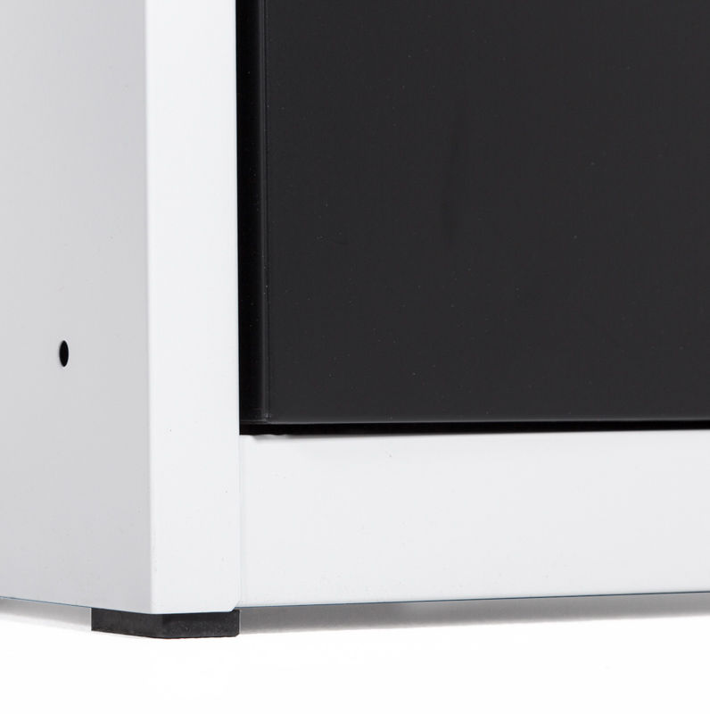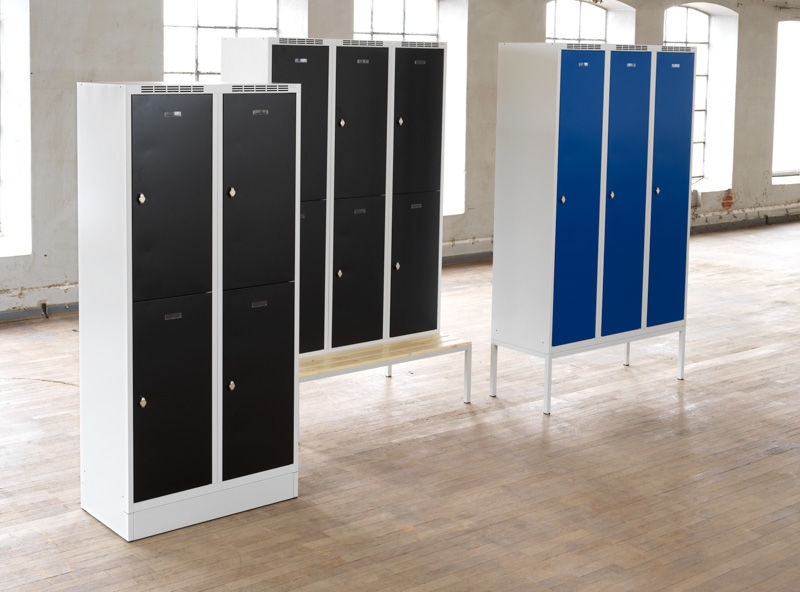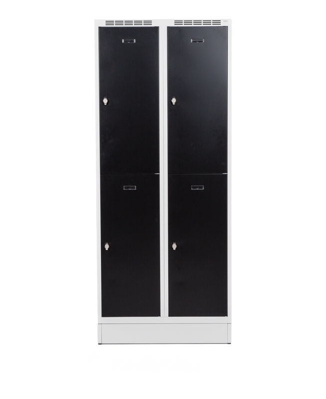 Omklædningsskab Hove, B 400 mm, 2x2 døre, gråt kabinet sort dør. Omklædningsskab Hove. Her får du virkelig meget skab for pengene! Lige til at sætte ind på plads. Hurtig levering. Vælg mellem 2 forskellige fagbredder 300 og 400 mm. Leveres som standard med 40 mm sokkel med mulighed for at tilkøbe en ekstra høj sokkel, benstel eller bænkestativ. Skab med hel dør leveres med hattehylde, klædestang og kroge. Opdeling i 400 mm skabet til f.eks. at adskille beskidt fra rent tøj. Kabinettet er pulverlakeret i grå RAL 7035 og dørene er enten i blå RAL 5005 eller sort RAL 9005. Skabet er udstyret med klinke til hængelås i diameter 5-8 mm.