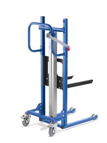 Løftevogn Ludvig, med dorn, med lasthjul. Materialeløfter med forskellige lastholdere til mange anvendelsesformål. Belastningstyngdepunkt 300 mm. Flytter materialer eller værktøj til den ideelle arbejdshøjde. Mobil med 2 drejelige hjul med bremser og 2 lasthjul eller med 4-vejs-chassis. Løftebevægelse ved hjælp af selvlåsende sikkerhedsspil og præcisionsrullekæde.