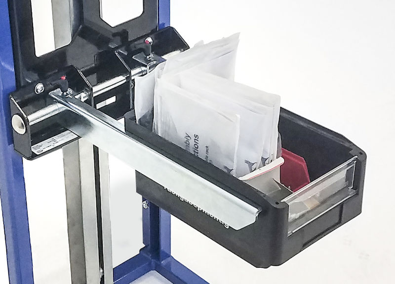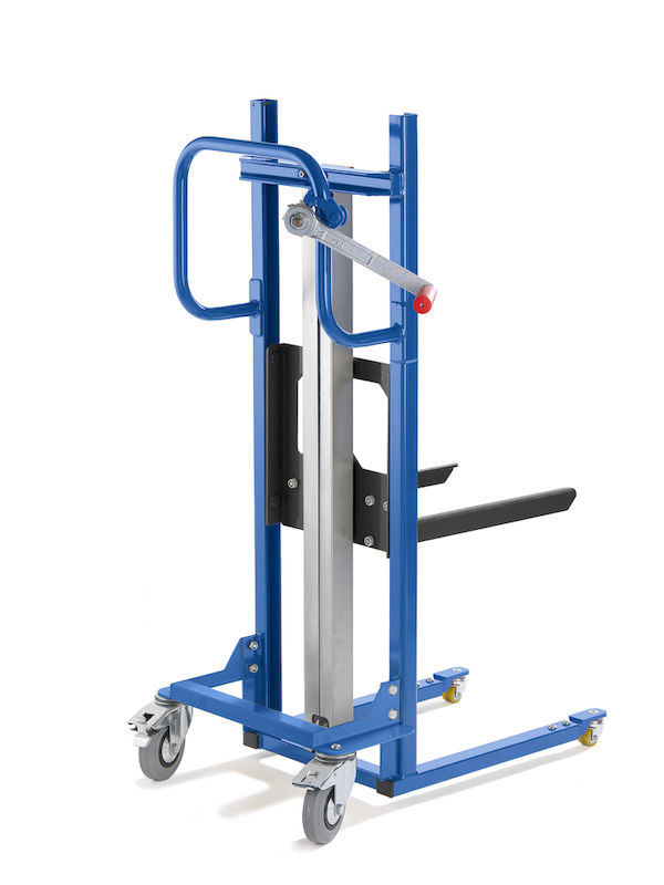 Løftevogn Ludvig, med indstillelig kassegaffel, med 4 drejelige hjul. Materialeløfter med forskellige lastholdere til mange anvendelsesformål. Belastningstyngdepunkt 300 mm. Flytter materialer eller værktøj til den ideelle arbejdshøjde. Mobil med 2 drejelige hjul med bremser og 2 lasthjul eller med 4-vejs-chassis. Løftebevægelse ved hjælp af selvlåsende sikkerhedsspil og præcisionsrullekæde.