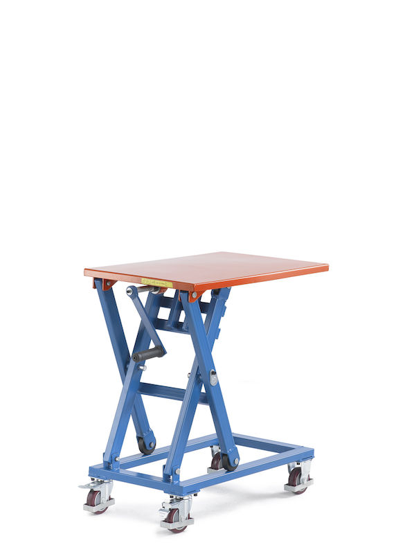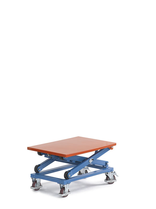 Løftebord Lars, signalblåt stel, platform: LxB 750 x 500 mm. Solidt og færdigudviklet redskab. Servicevenligt, med inspektionsstøtter.