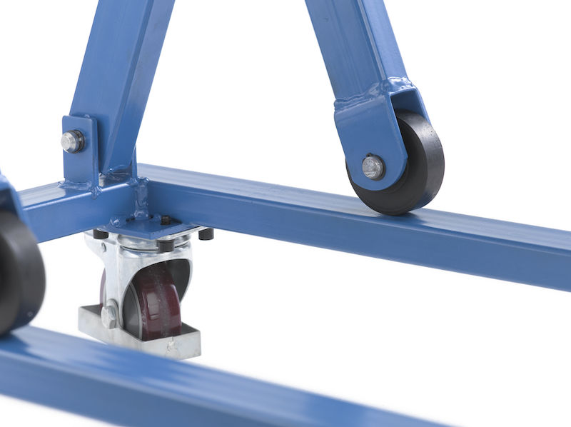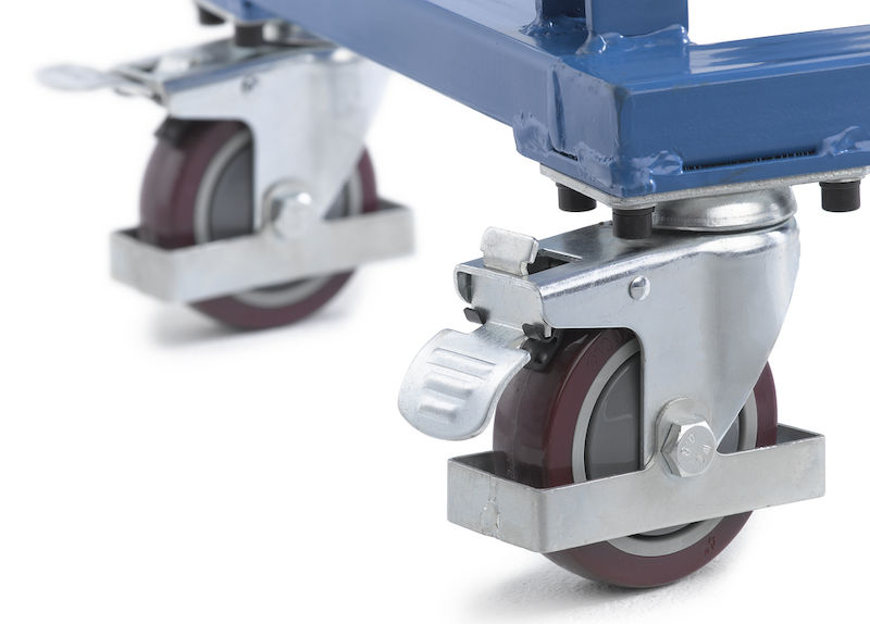2 drejelige hjul og 2 faste hjul, polyurethanhjul, fodbeskyttelse hele vejen rundt. Drejelige hjul med bremse.