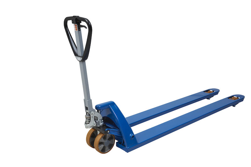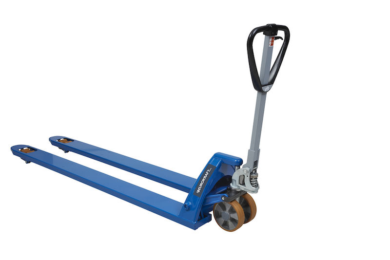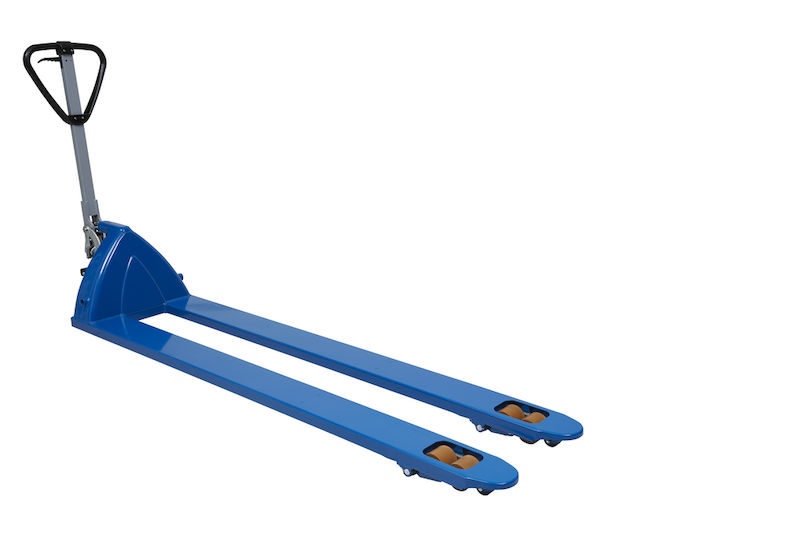 Palleløfteren har en ekstra lang gaffel til lastning af længere paller eller større gods. Palleløfteren fås i tre gaffellængder. Hjul med kuglelejer giver komfortable køreegenskaber, mens polyurethanhjulene er velegnet til non-marking kørsel på sarte gulve. Bogiehjulene gør det også muligt at bruge den på ujævne underlag.