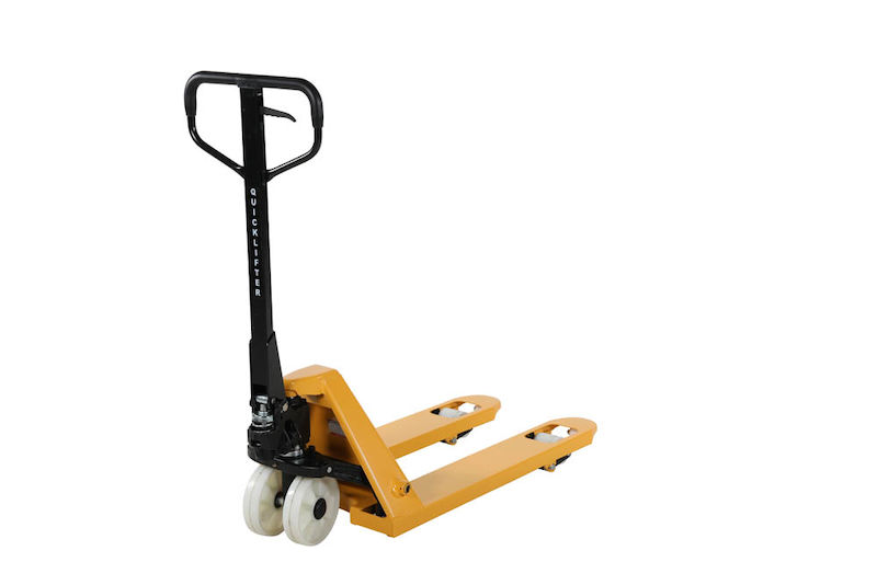 Palleløfter med quicklift, single nylon, 900 mm. Smidig palleløfter med Quicklift som standard (med overgang til normal løftefunktion når lasten overstiger 150 kg). Dobbelte klatrehjul samt afrundede gaffelspidser gør pallehåndteringen meget lettere. Gribevenligt håndtag i polyamid.