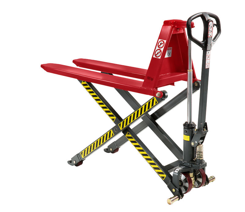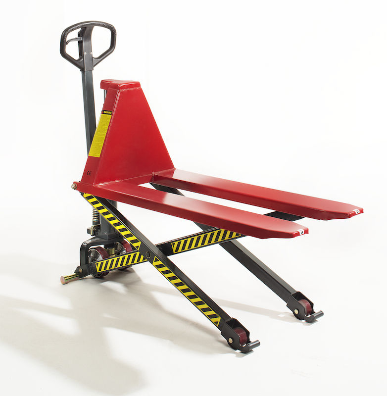 Sakseløfter Hugo, gaffellængde 1140 mm, lastkapacitet 1000 kg. Flyt, lever og løft laster: Denne sakseløftevogn eurokraft basic er udstyret med en manuel hydraulisk løfteanordning og er en praktisk og billig løsning til din lager- og distributionslogistik med en lastkapacitet på 1000 kg. Takket være QuickLift-funktionen sparer du værdifuld tid og energi. Systemet er aktivt op til en lastkapacitet på 100 kg og løfter laster hurtigt, mens tungere last løftes langsommere, men nemt. Dette gør det muligt at arbejde ergonomisk med palleløfteren og gør det lettere at løfte laster til den ønskede højde. Den automatiske styring af sænkehastigheden og en overbelastningsventil beskytter enheden og giver sikkerhed. Ekstra støtter gør, at vognen står sikkert, når gaflerne er løftet, mens hjuludstyret i polyurethan ikke efterlader spor og er gulvskånsom. Forbedr dine arbejdsgange med den praktiske sakseløftevogn eurokraft basic med manuel hydraulik – kan også bruges som palleløfter.