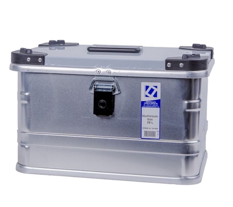 Aluminiumskasse Viktor, 29 liter, LxBxH 440x285x340 mm . Aluminiumskasse Viktor. Robuste transportkasser i aluminium med forstærket låg og kraftig bund. Opbevaringskasserne er beregnet til industrielle eller generelt hårde miljøer. De er udstyret med beskyttende hjørnebeslag, der også letter stabling.