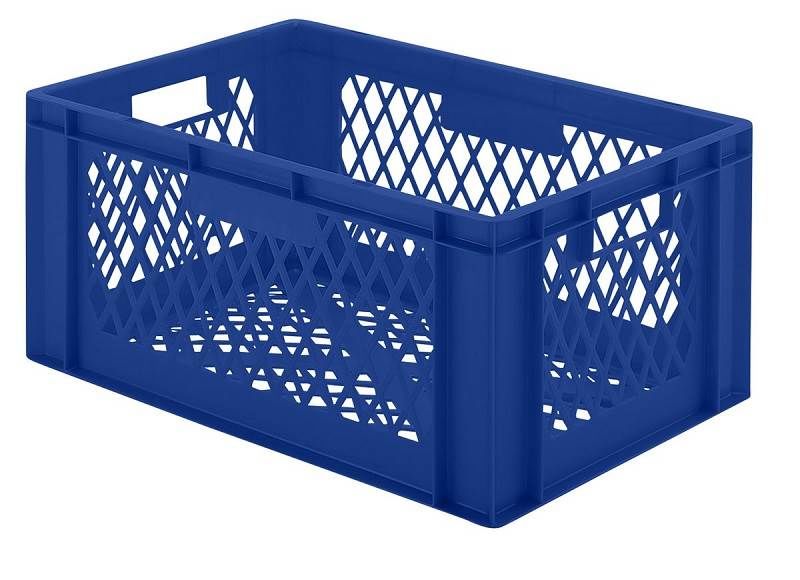 Eurokasser Teff med åbne sider og bund, LxBxH 600 x 400 x 266 mm, blå, 5-pak. Stabelkasse i euroformat, sider og bund med åbninger. Til næsten ethvert behov på lager, i produktion og til transport Af levnedsmiddelgodkendt kvalitets-polypropylen Stor stabilitet Temperaturbestandig fra –20 °C til +60 °C, kortvarigt op til +90 °C Modstandsdygtig mod mange typer af syre og lud Størrelserne er afstemt efter pallemålene 1200 x 800 mm og 800 x 600 mm Tilpasset til rullebane Kan også stables med låg uden problemer. Beholderne leveres i prisgunstige pakker.