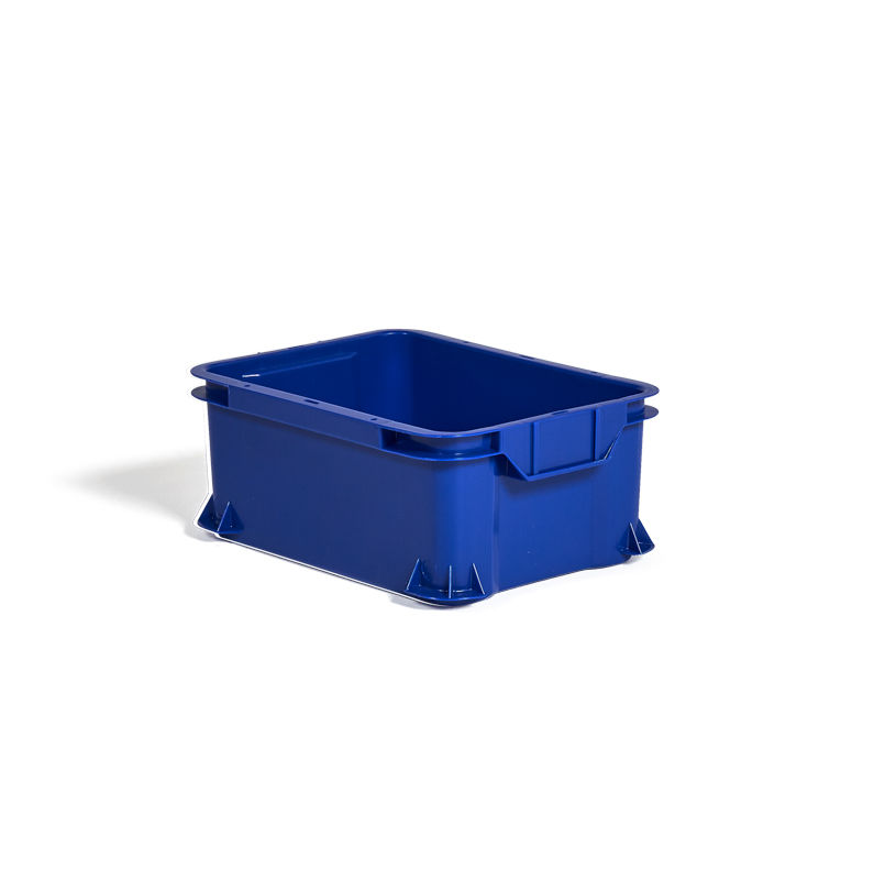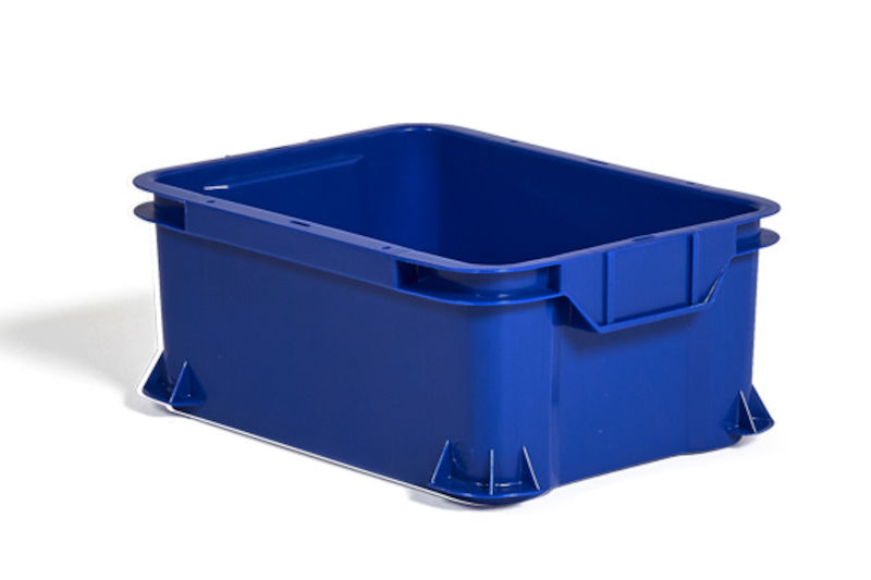 Plastkasse, Uniback, stabelbare, volumen 14 liter, blå. Temperaturbestandig fra minus 40 grader til plus 90 grader. Kasser med enkle, store flader og plan bundkonstruktion, der klarer alle transportbaner. Afløbshuller i sargen til opvaskevand. Store, kraftige udvendige håndtag giver et godt greb. Luftspalte ved håndtaget hindrer kondensdannelse på opbevaret gods ved stabling. Udført i HD-polyeten med temperaturholdbarhed fra -40 til +90 grader celsius. Fødevaregodkendt.