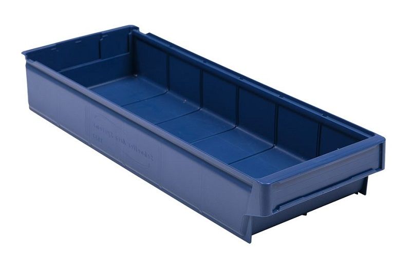 Lagerkasse fra Schoeller Allibert, H 100 mm, B 230 mm, blå, L 600 mm. Kasse i plast til opbevaring af småting.